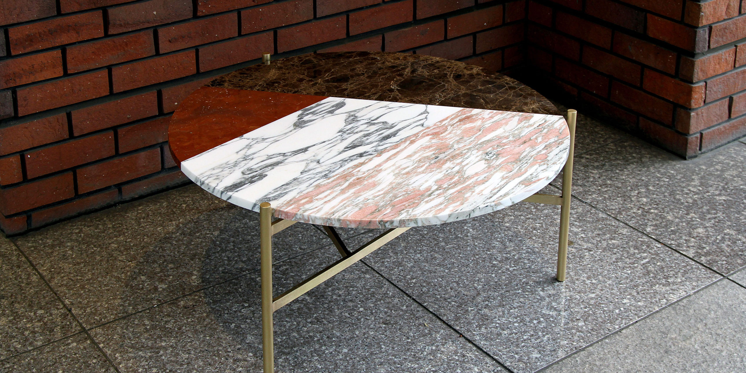 今回製作したのはエンペラドールダーク(茶)、ノルウェージャンローズ(ピンク)、アラベスカート(白)、ロシアンレッド(赤)の4石種をパッチワーク状に貼り合わせた天板、フレームは真鍮無垢材の梨地仕上げの組み合わせです。