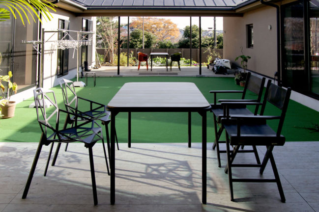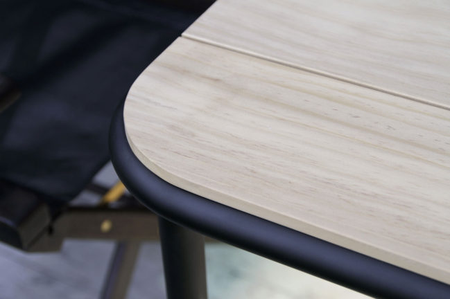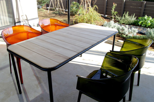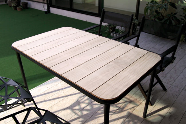個人邸用にオリジナルでデザインしたガーデンテーブルと、それに合わせてお選びした椅子の納品。 丸パイプと木の組み合わせで、四隅が角丸の柔らかいデザイン。天板のナチュラルな仕上げと黒のフレームがスッキリとした印象を与えます。