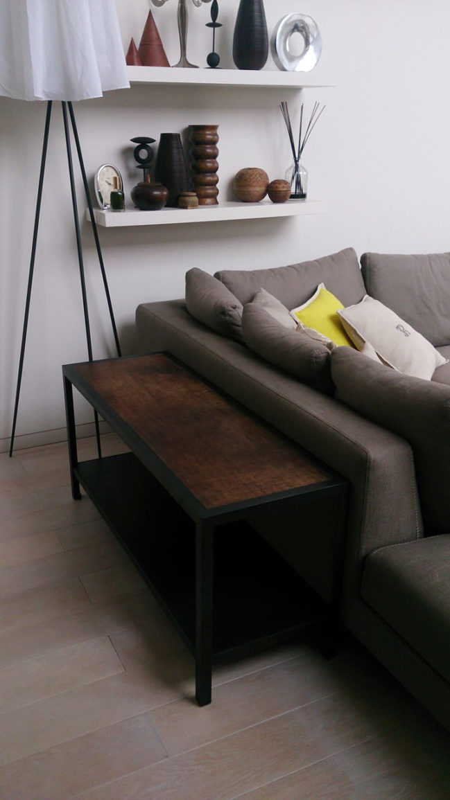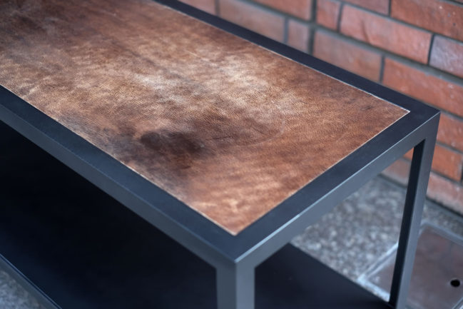 個人邸オーダー家具のデザイン。ソファ脇に合わせたサイドテーブル。クロカワ仕上げのスチールとバッファローの天然革の組み合わせ。
