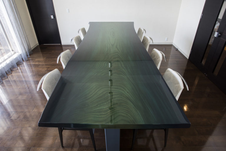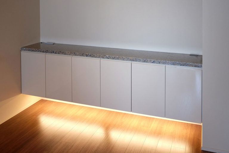 壁と壁の間のサイズぴったりに合わせて製作したダイニングボード。全て開き戸で引き出しも扉の内側に取り付ける事ですっきりとした印象を与えます。
