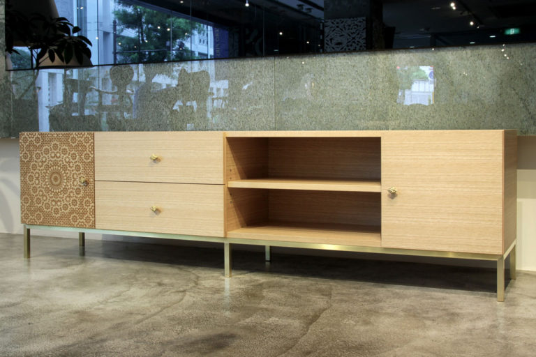 個人邸オーダー家具のデザイン。シンプルなデザインのTVボードですが、レーザー加工を施した扉と真鍮の取手、脚がアクセントとなっております。